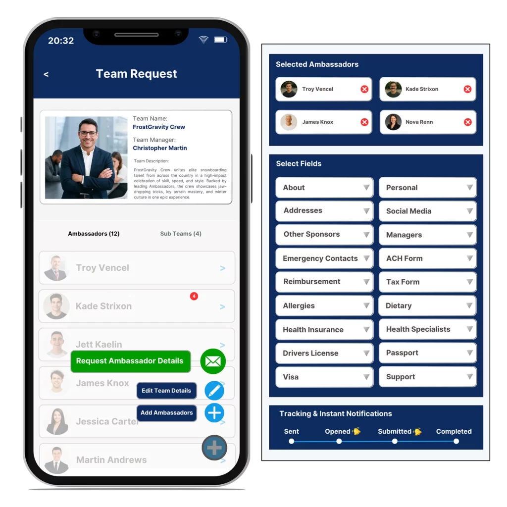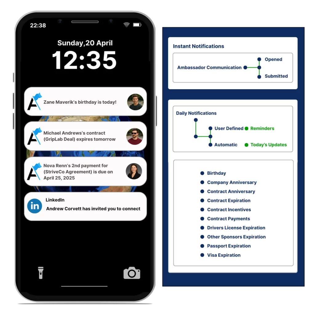 Use push notifications, reminders, support material uploads, and update Requests to deliver essential information and collect Ambassador updates—no messaging threads needed, with real-time alerts for the organization.