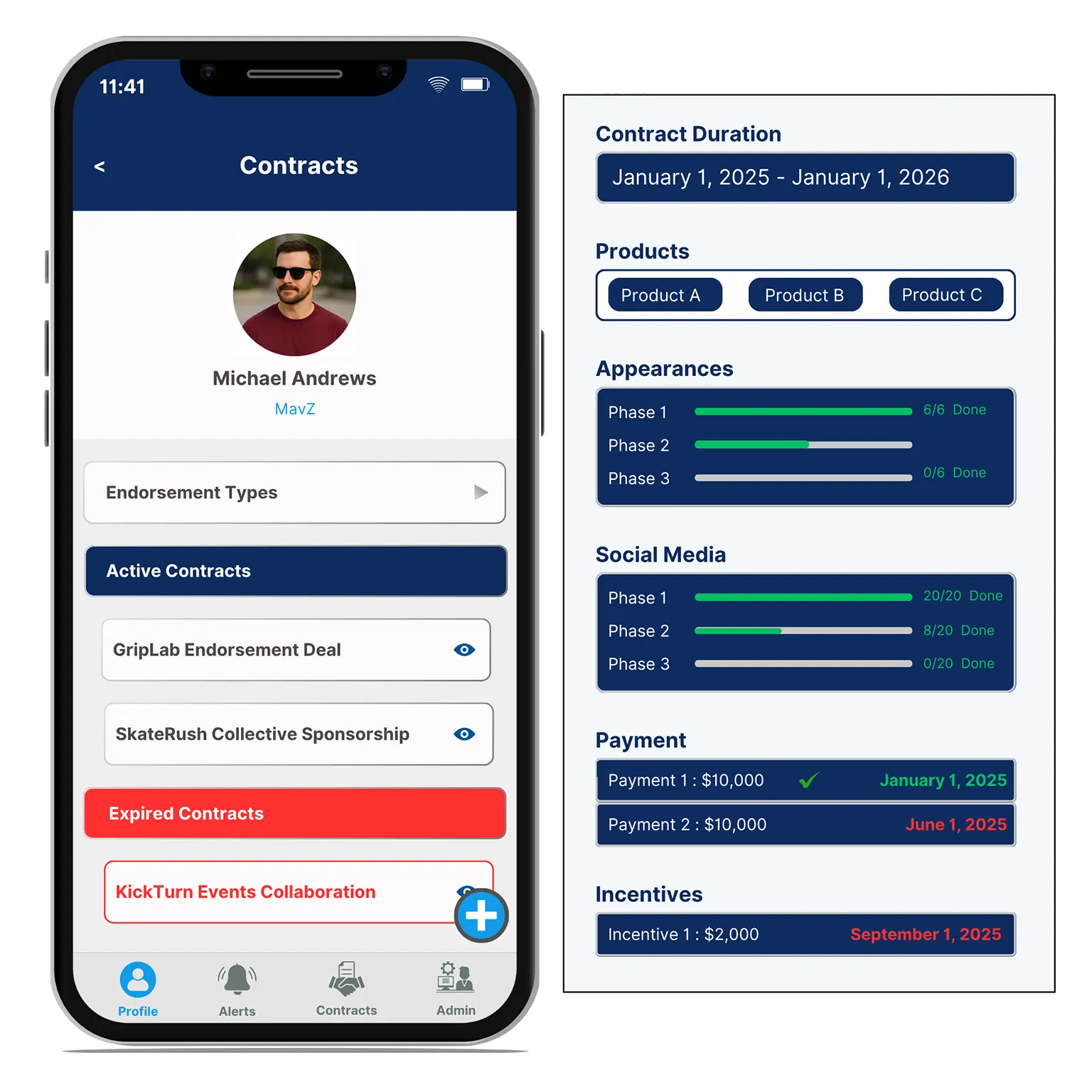 Set appearances and social posts per contract, break them into phases, mark Reserved items, and track completion with summaries.