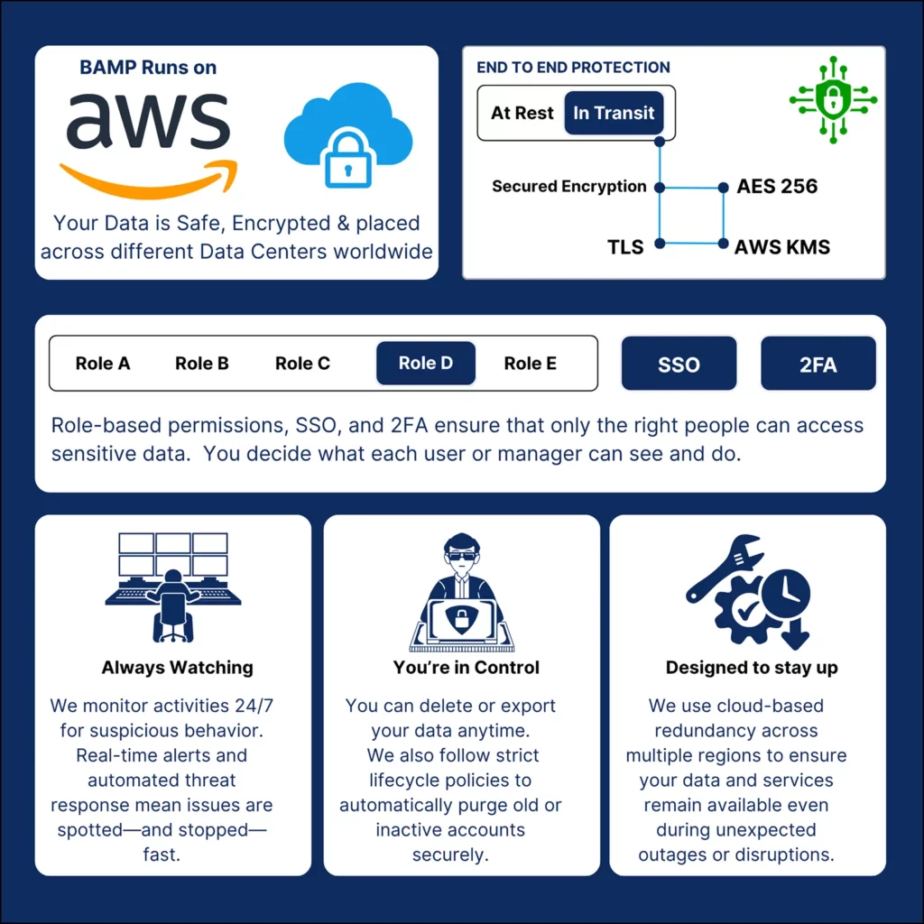 At BAMP, security isn’t an afterthought—it’s built into the core. We follow industry-standard best practices to ensure your data is encrypted, private, and accessible only to the right people.