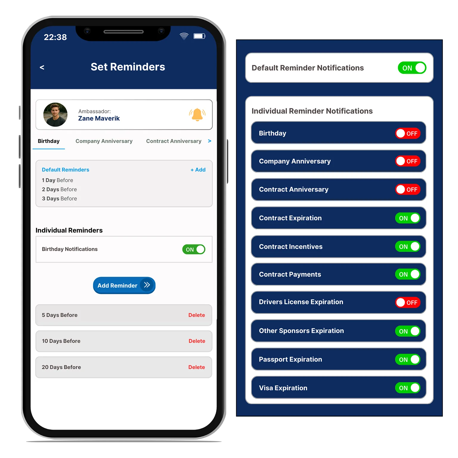 Manual custom reminders let you track anniversaries, payments, and more—for Ambassadors you manage. View and filter by type or timeline.