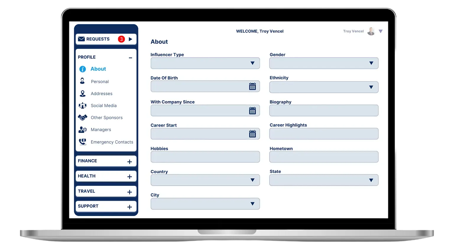 Ambassadors receive structured Requests from their organization to update specific information. They can save progress anytime and submit once all updates are complete—triggering real-time notifications to the organization.
