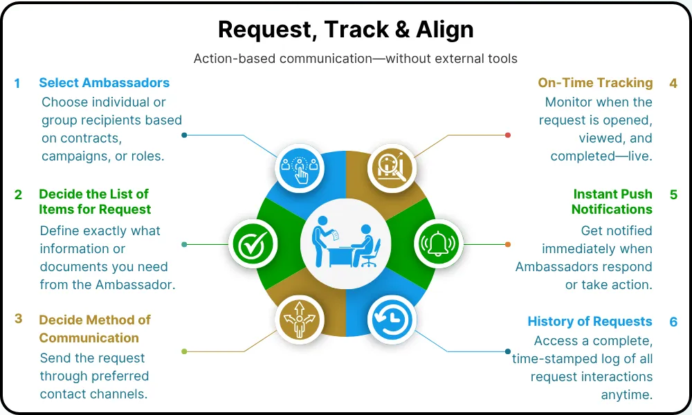 Send clear, structured Requests to Ambassadors—ensuring required updates are completed without missing details.
