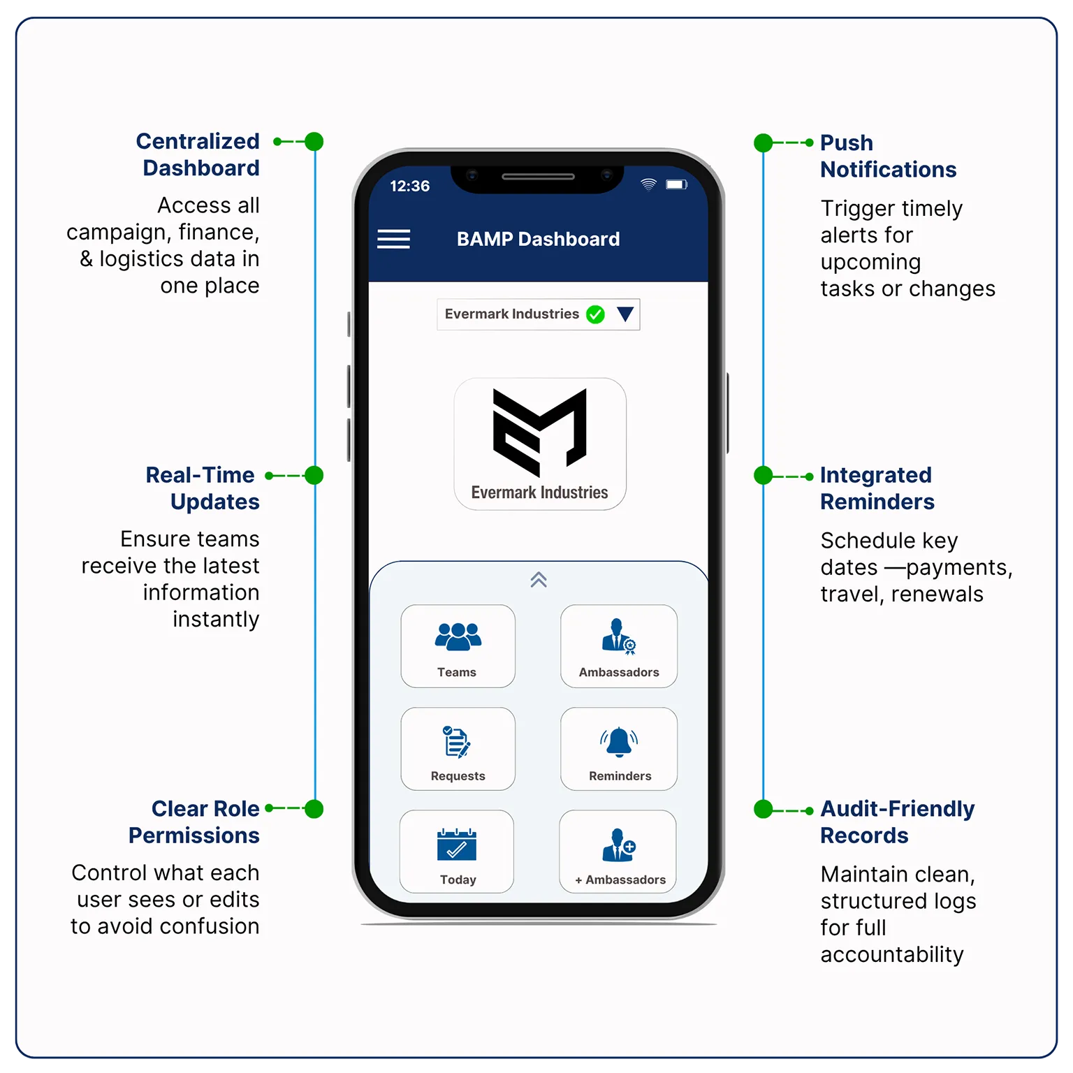 BAMP centralizes ambassador data, reminders, contract progress, and travel needs—eliminating manual tracking and reducing errors.