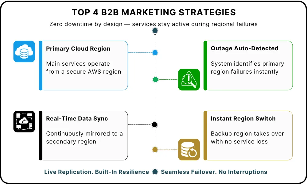 Our infrastructure is designed for high availability, with data replication across multiple AWS zones. Even if a regional outage occurs, your services and data remain unaffected, ensuring seamless continuity.